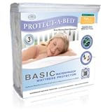 Protect-A-Bed Mattress Basic Protector. The Protect-A-Bed Basic Mattress Protector is an economical solution to mattress protection, offering the standard features and benefits of our other premium mattress covers. The Basic Mattress Protector features our unique Miracle Membrane, which keeps your mattress free of spills and stains while remaining cool and comfortable to sleep on. Miracle Membrane also provides a barrier to dust mites, allergens and other irritants. The fitted sheet style mattress cover is easy to remove, re-use, and is machine washable. Basic Waterproof Mattress Cover. Features and Benefits: Waterproof yet air vapor porous - acting the same way as human skin. Effective in preventing bacteria and dust mites from breeding in your pillow and mattress (a major cause of asthma, eczema and rhinitis). Protects mattresses from stains (accidental spills, perspiration, bodily fluids). Machine washable on hot, tumble dry on low. Especially helpful in cases of incontinence. Ultra thin with four-way stretch does not detract from the comfort of the mattress. High Quality Fitted-sheet style. Soft and semi-absorbent Mattress Protector. Our protectors are the gold standard in protection! Made of soft cotton terry backed with a breathable polyurethane film, our mattress & pillow protectors repel liquids and stains while allowing body vapor to breathe. The revolutionary barrier fabric also prevents bacteria and dust mites from breeding (a major cause of asthma, eczema and rhinitis). Remember. . . it only takes one accident to spoil a good mattress, pillow or duvet. A must for families with children and household pets! These mattress protectors go on just like a fitted sheet and also help with "sheet creep"!